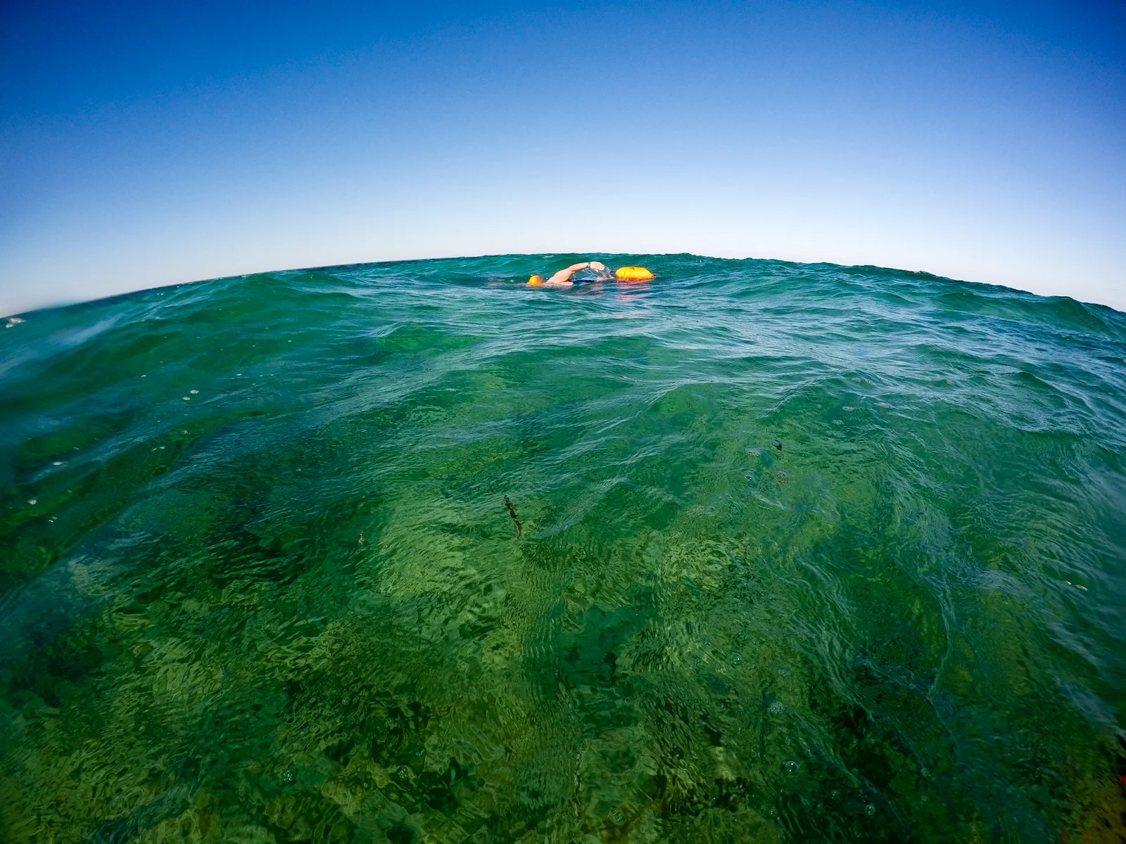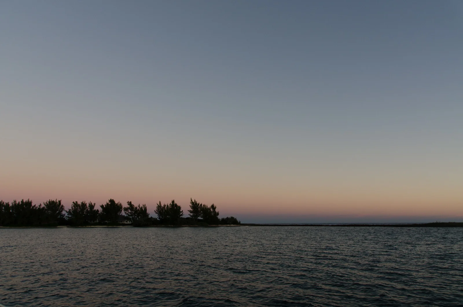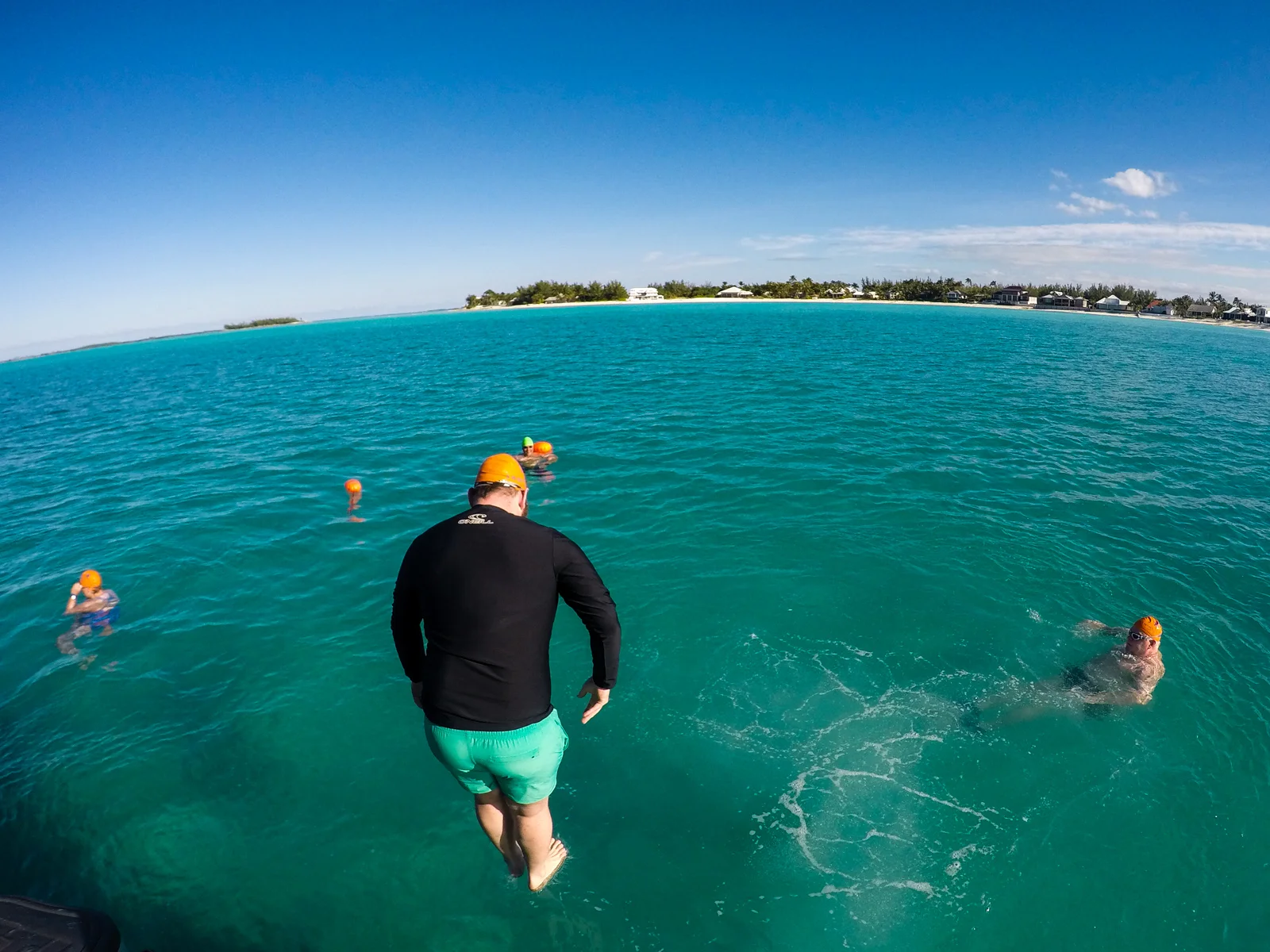 Simon led his group back into the bay, where by all accounts they bobbed around and looked for wildlife and had a typically good time before climbing back aboard. True to my word, I followed through on my commitment to swim Janine big. We crossed the mouth of the bay, still in the big water, to the inside point. When we reached it, the thermocline was stunning. A sharp, invisible line in the water. Like walking through a door, the water temperature dropped a full 5 or 6 degrees. Maybe 7. You could see the temperature waves underwater. The jellies seemed quite unwilling to walk through the same door we passed through, so I knew there would be no more of that. Out of the Atlantic, into the shallow Sea of Abaco. Out of the warm, into the cold. Deep green to turquoise green.