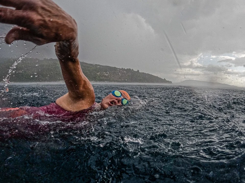 I woke to Lou Lou bearing coffee (bless) and a perfect pink sky. We jumped into water like glass around 8am. When the sea is flat like this, we like to take advantage and plan a long, smooth swim. Simon and I plotted a long course which gave our swimmers the opportunity to go anywhere from 1.5 to 2+ miles. Simon took Katharine, Allyson and Dominique on the long haul around the far point to another beach, while Mandy and I made it to the point and turned around. The water is like velvet - smooth and soft. Crystal clear beneath us, dramatic skies above. The last 15 minutes of the swim were in an all out deluge - a driving rain that dimpled the surface and created a white layer of more water than air just above. I love swimming in a good rain like this. Mandy and I swam side by side, occasionally bumping elbows, making eye contact on every breath, and in this way we flew through the downpour, the skies clearing just as we arrived at the stern. We swam 1.75 dynamic miles in all.