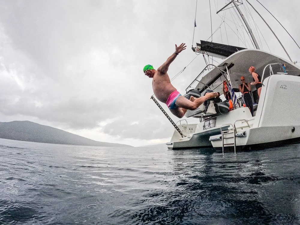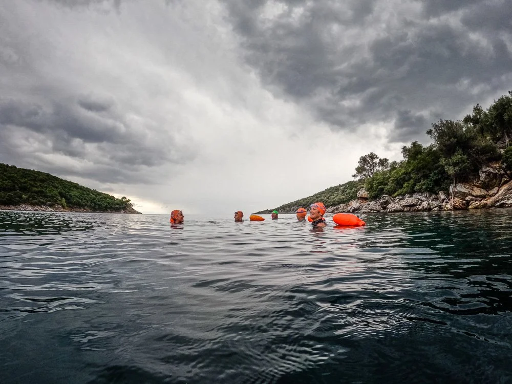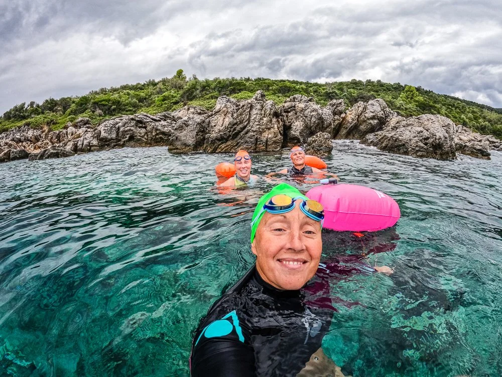 We cringed our way into wet bathing suits and neoprene vests, and everyone jumped in. Calm smooth waters juxtaposed the dramatic skies, and we all cruised along the steep walls of the bay. The flat surface gave us all a chance to work on the stroke tips Simon has given us after watching our stroke videos. I took Dominique and Mandy on a wall wander for about a half mile out then back, while Simon pushed the pace with Katharine and Allyson to get to a swim through he remembered from last year. They covered two miles total in 45 minutes, and they enjoyed several turns at the swim through to boot.