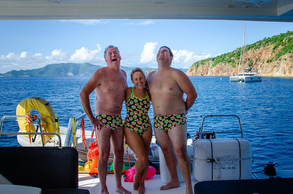 This trips guide suits feature some sort of citrus fruit on a deep blue background! Waiting for Funky Trunks and Funkita to sponsor our guides!
