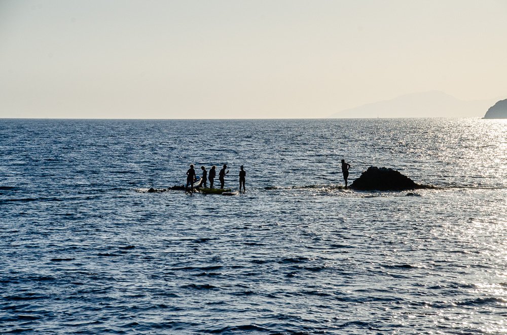 I have an obsession with old things. I live in a house built in 1859, drive a truck built in 1929, and last year I held an archaeological dig/party in my backyard. Here on the Mediterranean coast, humans have been busy for thousands of years, and they’ve left a trail of stuff both on land and underwater. It’s quite the playground for a guy like me. This morning our swim followed part of the trail of stuff they left underwater. As we swam along the coast, amphorae (ancient trading vessels made of clay) fragments dotted the sea floor, most encrusted hard to the underlying rocks. One particular piece was quite large, a section of spout with handles and part of the bulbous bottom. When did it get here? Was there a shipwreck? What did it hold? When and where was it made? We might have enough clues to take a guess at the answer for the last of these questions, many museums and universities have great amphorae databases, and Heather got some great photos for which to compare. More research required. And hey, if anyone reading this can identify this relic, please reply below.