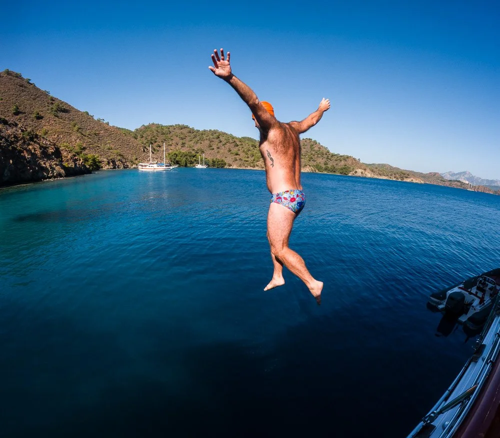 Back on the Gulet, tea and cakes. We moved again to a majestic looking island with tower-like cliffs, to be swum around tomorrow morning.