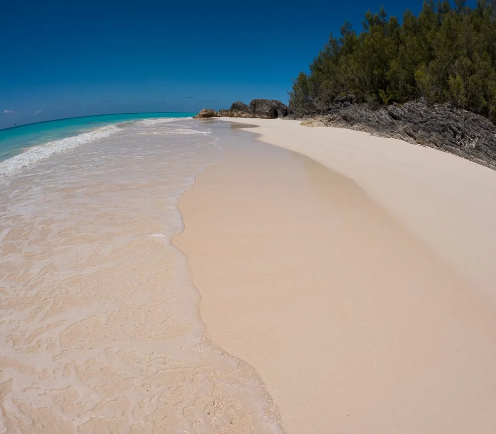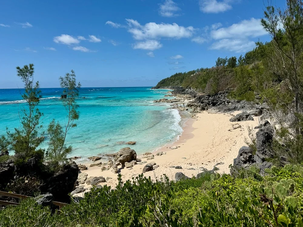 We’ve seen a lot of shades of blue in the oceans over the years on Swimvacation. Deep sapphire blue in the Mediterranean, milky blues in the Bahamas, blue-raspberry slushy blues in Hawaii. Bermuda has its own style of blue water: it’s light turquoise, it’s stunning, and there’s a lot of it, stretching from the beach to sometimes several hundred yards out to sea. This is the blue that we saw as we drove (on the left!) along the south shore of the island to our first destination, Church Bay.