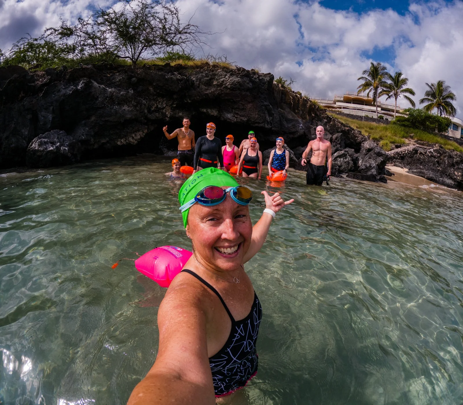 Beach 69, so named for the number of a telephone pole near the park entrance, is steps from our house here in Hawaii. We swim in Waialea Bay almost every day, and this morning I checked out the conditions with Nancy. We were thrilled to see flat, calm water. The whole group soon jumped in, and we had a lovely swim along the north side of the bay to a colorful reef, then across the bay, then along the inside to our starting point. We saw turtles, Nenue fish, 4 kinds of urchins, and a large group of big, colorful Humuhumunukunukuapua’a, the Hawaiian state fish. Heather took some video of the guest’s strokes, which I’ll review with them tomorrow.