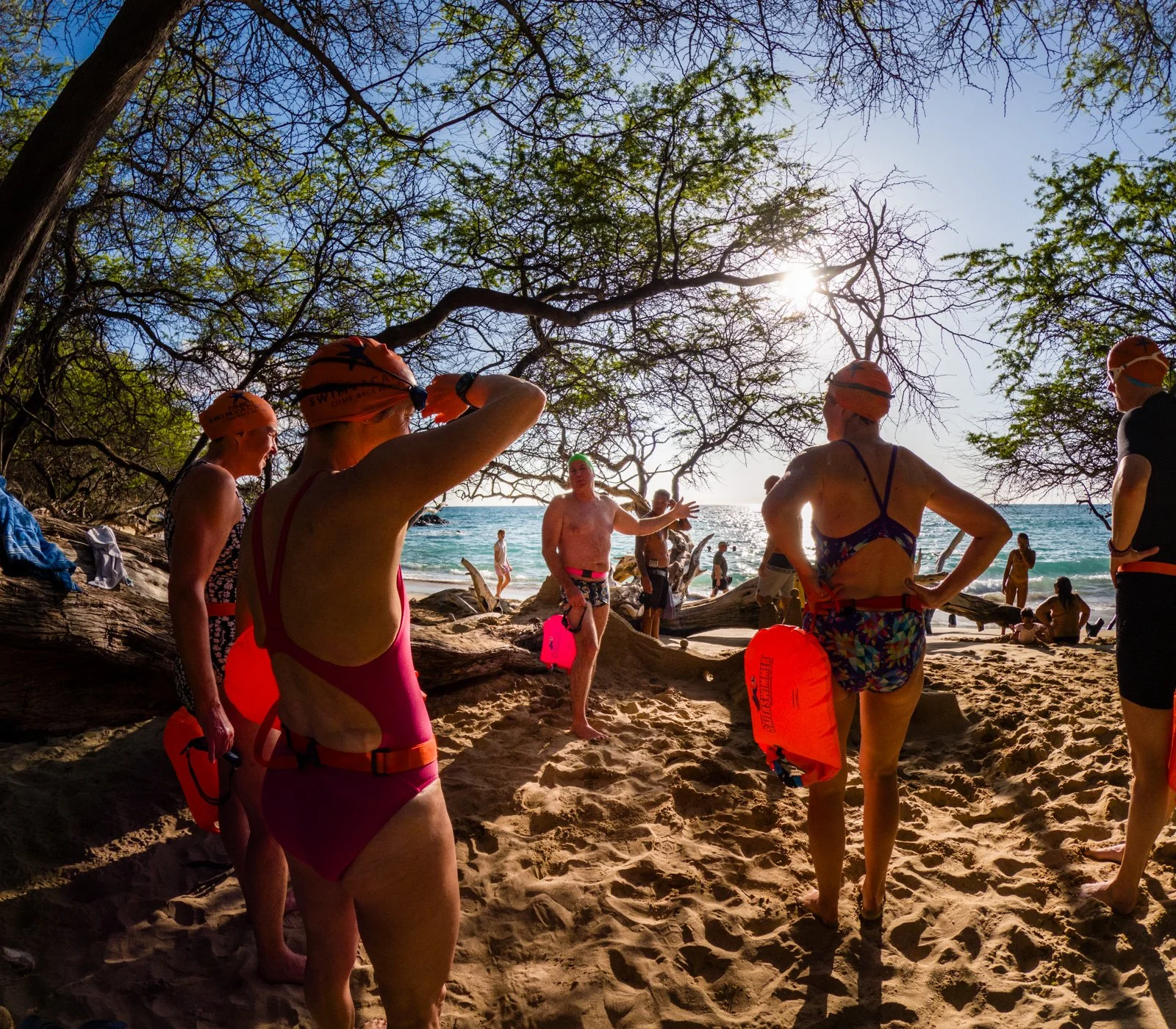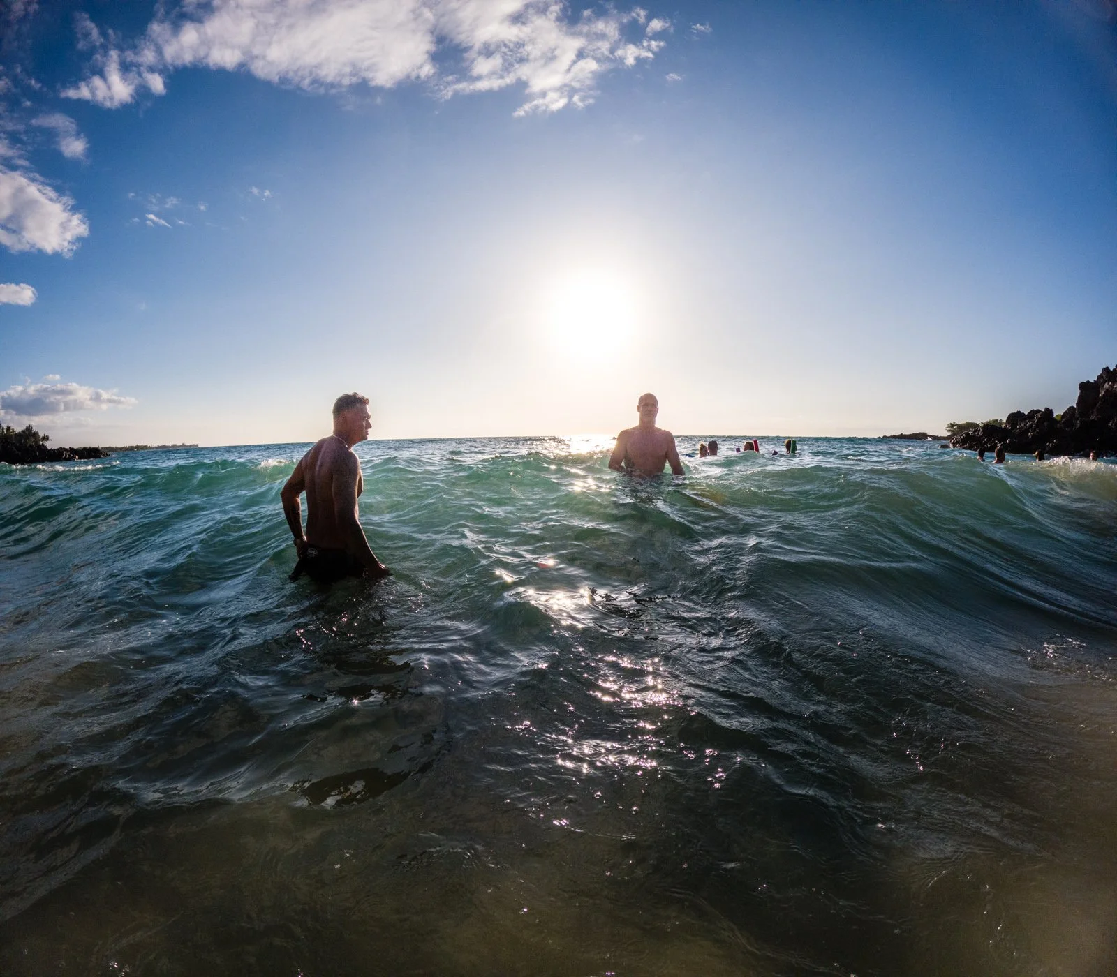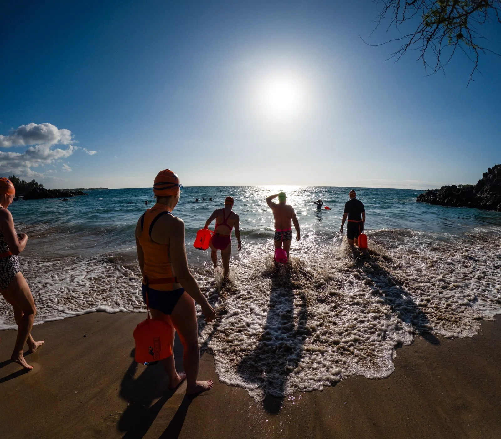 We get the EEs settled into their rooms, and give our usual SwimVacation talk about what to expect for the week, and to expect some unexpected things, too. They’re ready for a swim, so we jumped into the bay, which was typically choppy at this time of day. This group didn’t mind at all, and stroked into the sun and wind to a reef at the mouth of the bay. We took several breaks to orient ourselves, noting landmarks for navigation.