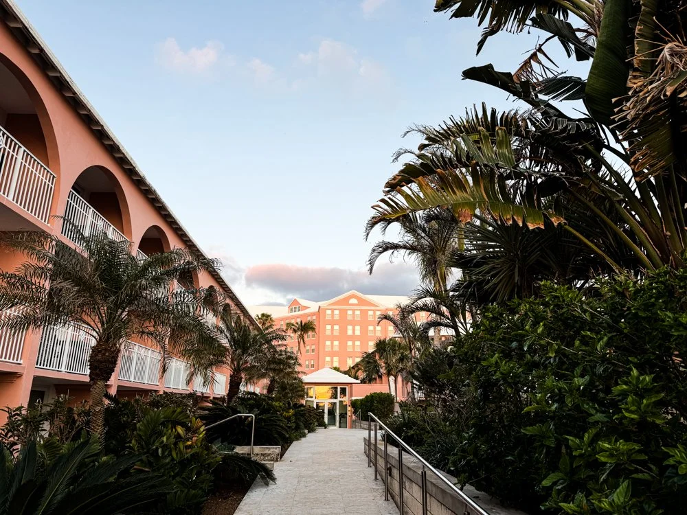 A morning view of the Hamilton Princess as we make our way from the Bermudiana Wing to the Gold Lounge for breakfast. Each day we pass this little pink guy from the hotel art collection. We wave hello on our way by. - HP