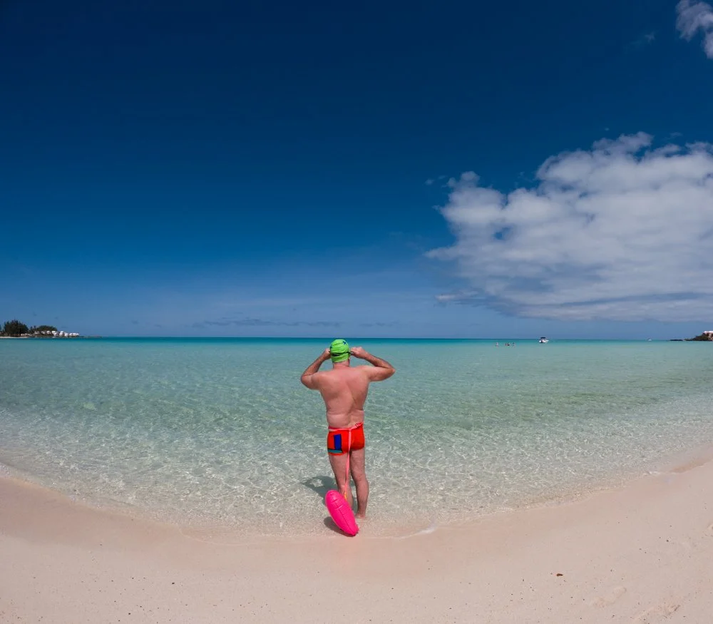 It’s Good Friday, a celebratory day in Bermuda. Many shops and offices are closed, and public parks and school grounds fill with pop-up canopies and families and music. The beaches are also busy with much of the same, but with lots of people flying kites, many of them home-made. Kite making is a tradition here, and the skill gets passed down from generation to generation. Our first stop of the day was at Horseshoe Bay to check out the scene and scout a potential swim. Kites filled the air, children played in the waves, seniors watched from beach chairs. We saw someone swimming the length of the beach, which was a good sign. There’s a big hill to climb at one end, another tiny cove, stunning blue water. There’s a real bath house, with changing rooms and restroom facilities that I gave a B+, a strong score for a busy day like this.