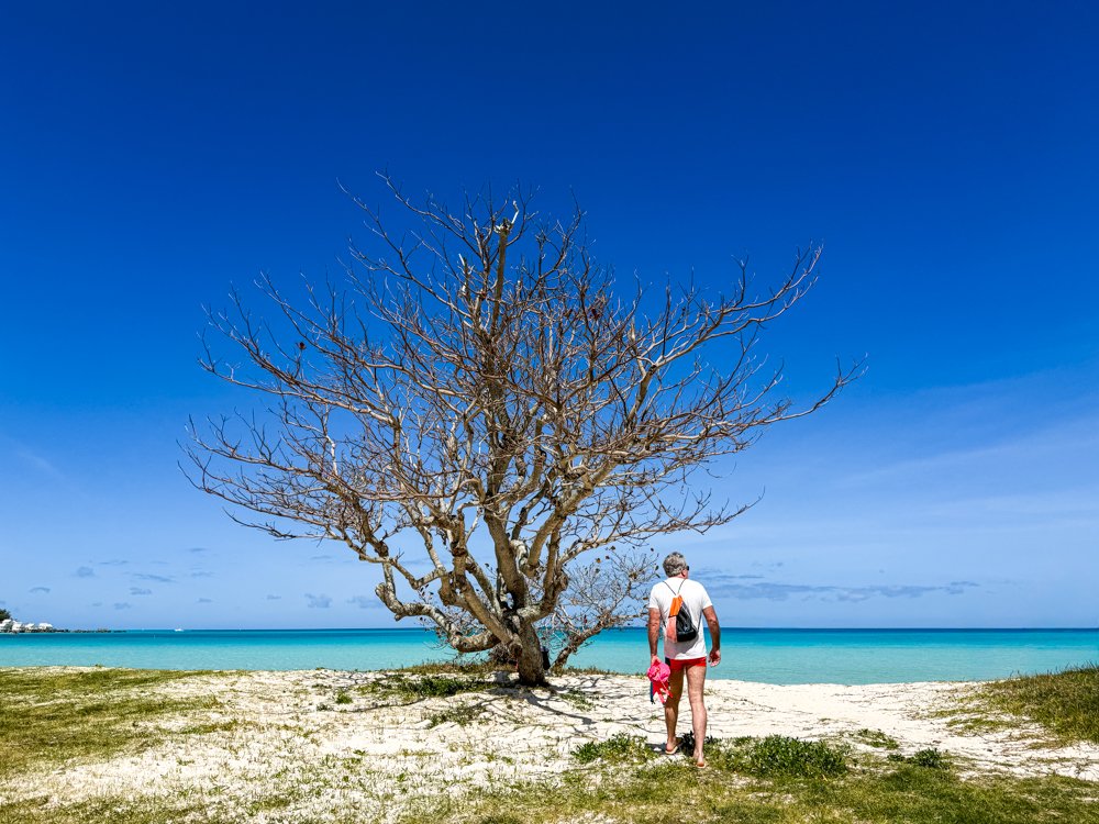 Our next stop was Long Bay Beach and Park, way out on the westernmost end of the island, opposite from where we were yesterday at Tobacco Bay. This place has a nice big grassy park, portable toilets (B+), a very long white sand beach, and those turquoise blues that make you want to swim. So we did, setting a course to Daniel Island, less than a mile away. No wetsuits today, with bright sun and water temps in the low 70s. We swam along an abandoned eco-resort that I am sure someone will snatch up and re-develop one day. A mostly white sand bottom with the occasional coral head, some fish, and a 1 knot or so current pushing us along. There’s a small gut, or channel, between the main island and Daniel Island, and we could tell the current was rushing through there at a decent clip. We made a plan and swam across, reaching the island with no problem. Swimming around the back, we found some great caves filled with hard and soft corals and dramatic rock formations. Getting back to the main island was a bit tricky, with the current working against us, but we made our goal with no problem, as the deep, fast water in the channel was only a few meters wide. The swim back to Long Bay was glorious, and we arrived back on the beach tired but thrilled to have found another great swim.
