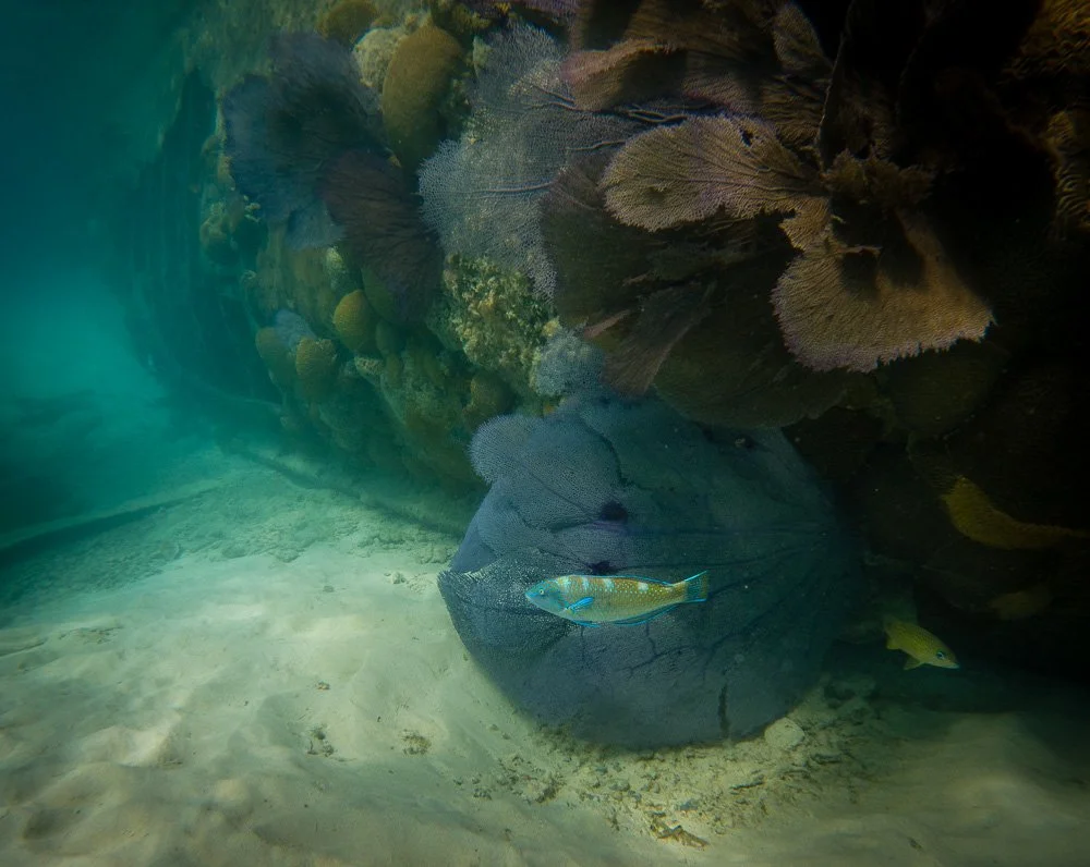 Heather and I are here to scout this place as an excursion for a SwimVacation trip here, so with our eyes on that we split from the group and jumped in the water on the north side of the island, and swam around to the 1930s wreck. It was filled with chummy parrotfish, and was generally cool to swim around.