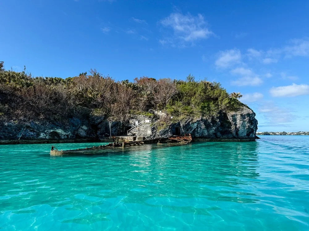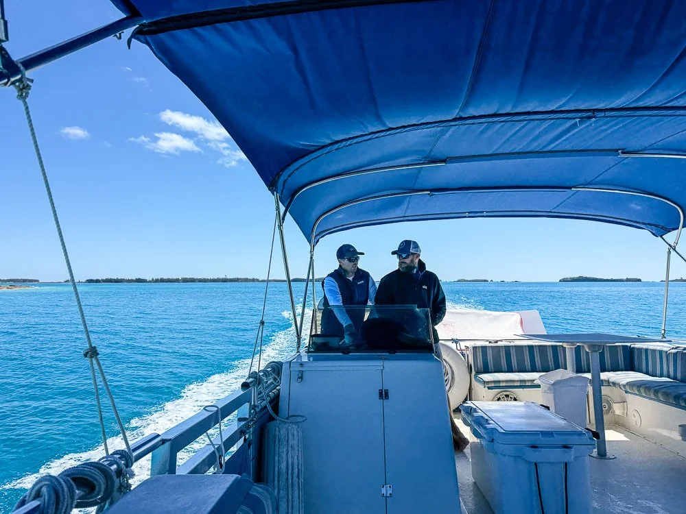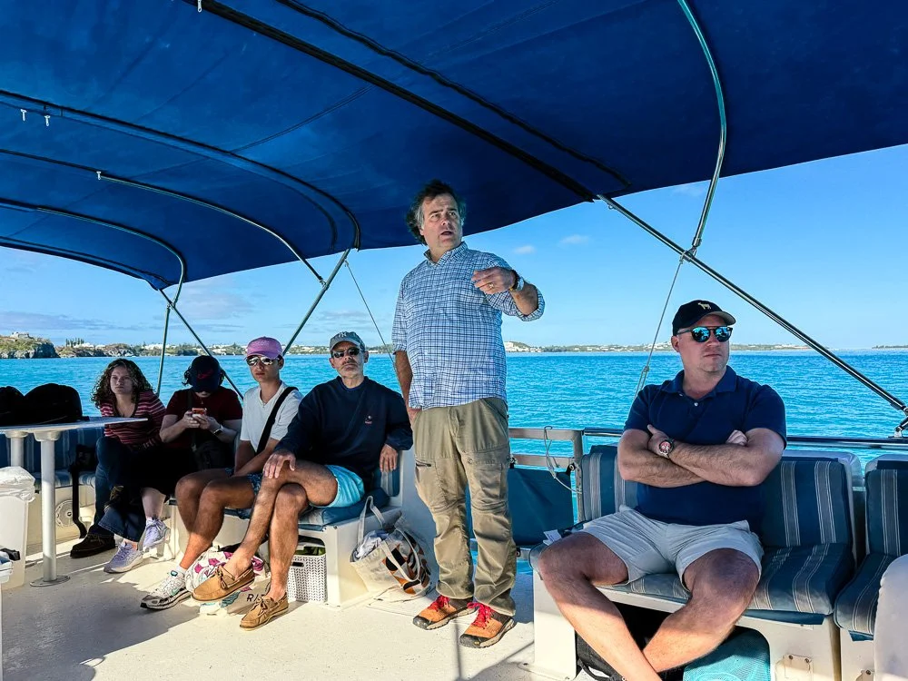 We catch up with the story of this bird here in 2026. Earlier in the week, Heather and I met with J.P., now a conservationist who conducts several projects on the Island. He invited us out here on our last morning in Bermuda for a tour, with several other people from around the island. We were picked up at a tiny fishing dock by skipper Chase and first mate Ben, who operate a big pontoon boat with a bimini top. As we motored across the bay, J.P. pointed out the ruins of some of the earliest structures built by Europeans in the new world as a flock of white-tailed tropic birds (locally known as longtails) performed mating rituals above us. We tied up to a dock on Nonsuch, in a cove created by a 1930’s shipwreck that was placed here as a breakwater.